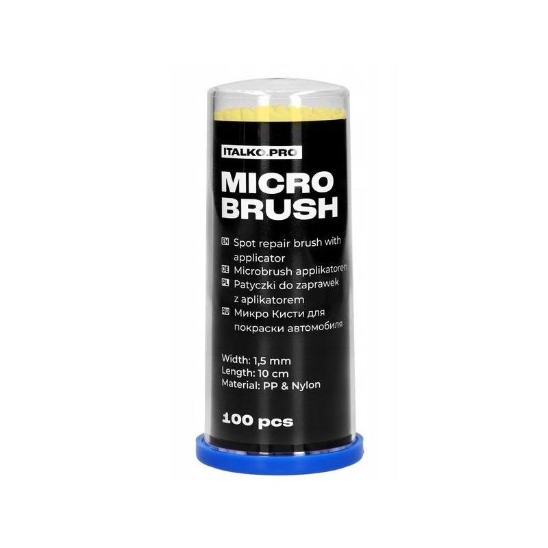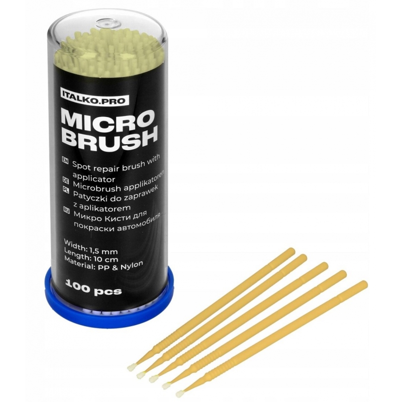 Italko Micro Brush to jednorazowe, bezpyłowe pędzelki przeznaczone do precyzyjnych napraw lakierniczych, idealne do wypełniania drobnych odprysków oraz nanoszenia cienkich linii farby czy lakieru. Korpus wykonany z tworzywa sztucznego i pluszowy aplikator zapewniają dokładną i wygodną aplikację na każdej powierzchni.