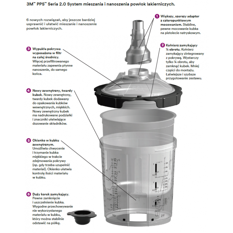3M PPS™ Serii 2.0 o pojemności 650 ml z filtrem 200 mikrometrów to kompletny system przygotowania lakieru, który pozwala na zachowanie czystości pracy, zmniejszenie ilości używanego rozpuszczalnika oraz skrócenie czasu czyszczenia.